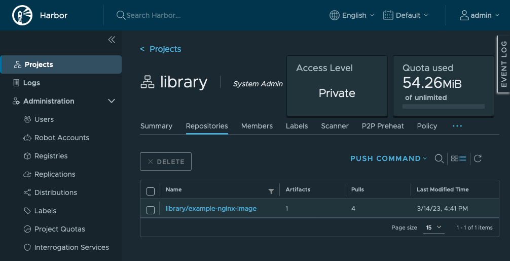 harbor.example.comwith your Harbor server’s domain.Your workstationsudo docker push harbor.example.com/library/example-nginx-image:1.0.0The push refers to repository [harbor.example.com/library/example-nginx-image] [...] 1.0.0: digest: sha256:f37ae9e729f7c3a0d5f8e84e8dcfc019093ac76b48e885568c8c5b6b163d5b43 size: 2191